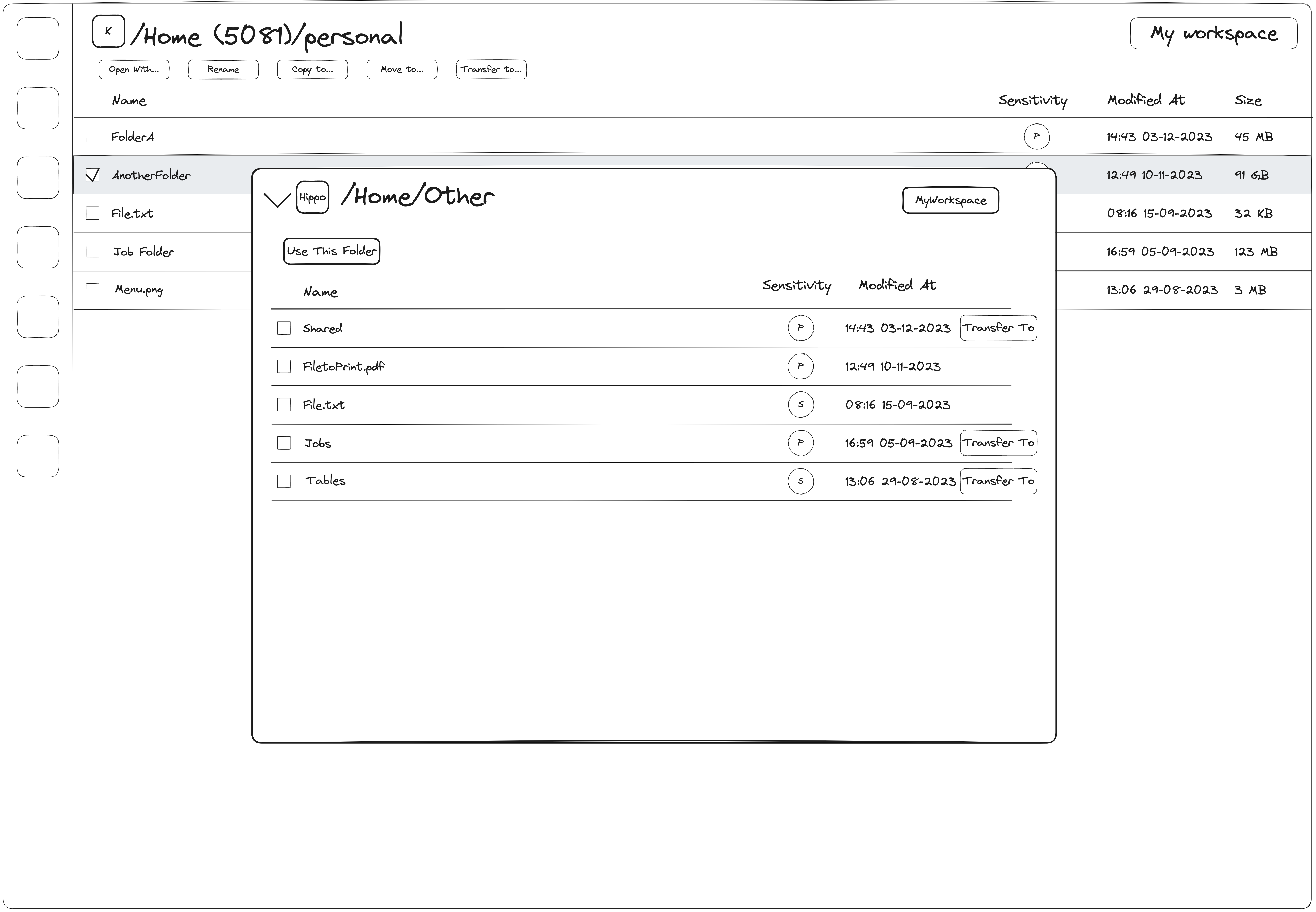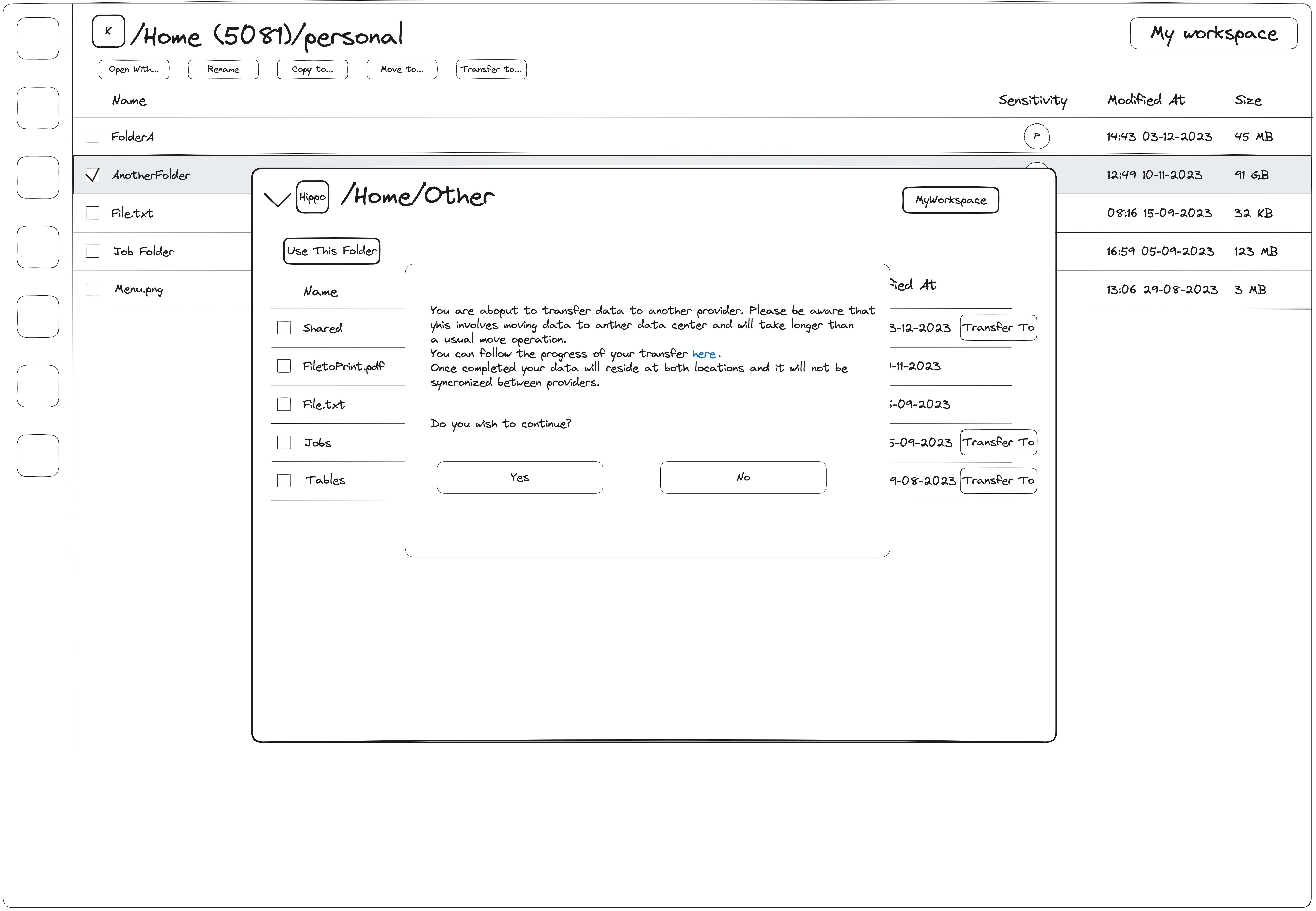 In this system dialog, the researcher can browse all the files they have access to. In this case, they navigate to a drive located at “Provider B”. Inside of this drive, they find their desired destination folder and select “Transfer to”. At this point, a message will appear explaining that a transfer between two separate service providers will take place.