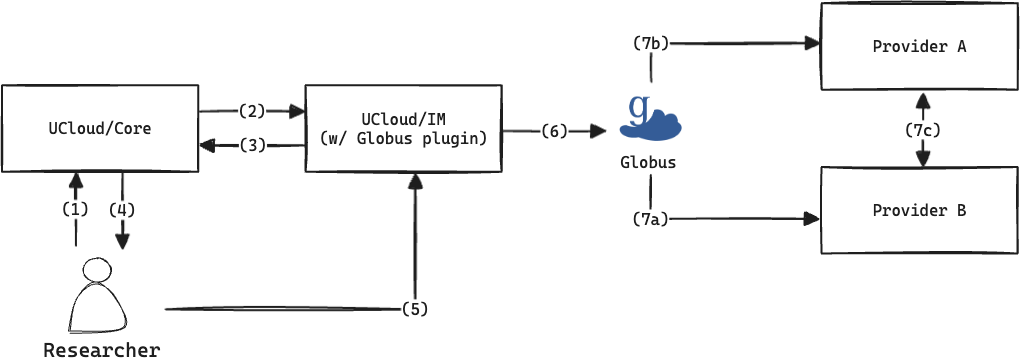 UCloud/Core contacts the Globus provider. As in the normal flow, the source provider is contacted.