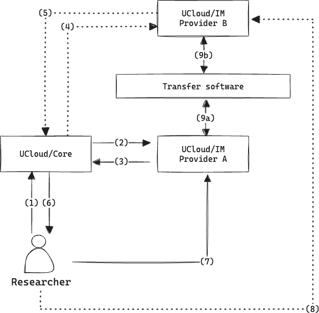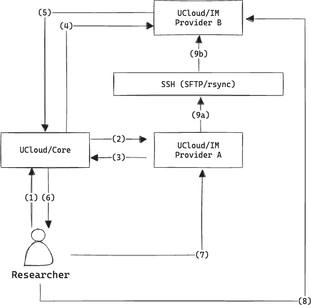 We start with an informal description of the feature from the perspective of a researcher. We assume that the researcher has two active resource grants, one at “Provider A” and one at “Provider B”. The researcher has already gone through the connection process and has thus already established a mapping between their UCloud identity and an identity at “Provider A” and another at “Provider B”. We also assume that “Provider A” and “Provider B” already have a legal framework in place which allows for this transfer to take place. Later in the story, we will highlight what happens if no such framework is in place.